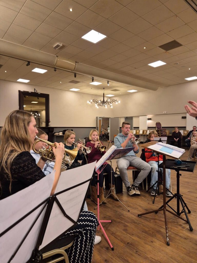 René krijgt ondersteuning van verschillende leden uit onze Brassband om de opstapleerlingen de basis aan te leren.